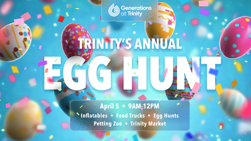 Come to enjoy age-specific egg hunts, inflatables, face painting, food trucks, a splash pad, the Trinity Market, & more! This is a free event for the community with the exception of the food trucks and Trinity Market. We will have egg hunts in 4 different shifts.