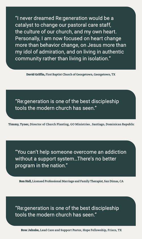 Re:generation is a Bible-based care and recovery ministry that includes both daily curriculum and weekly group-based support. But, above all, it is a discipleship program where people learn what it means to follow Jesus in all areas of life while encouraging (Hebrews 10:24-25), equipping (2 Timothy 2:2), praying for (James 5:16), and supporting each other (Galatians 6:2; 2 Corinthians 1:3-5). Only through daily dependence on Christ can someone find full freedom from sin and its effects (John 8:31-36; Galatians 5:1).
